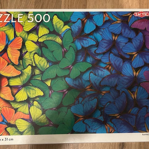 Tactic Puzzel 1000 Palapeli, jossa on kuva rakennuksen julkisivusta, jossa on punaiset ikkunat ja turkoosit ikkunaluukut. Palapelin koko on 1000 palaa.