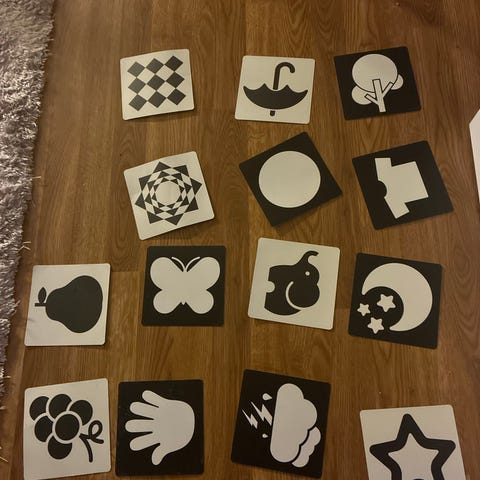 Baby Vision Trigger Cards mustavalkoiset kehityskortit vauvoille 0-3 kuukauden ikäisille. Kortit sisältävät 20 arkkia, yhteensä 40 sivua, joissa on erilaisia yksinkertaisia mustavalkoisia kuvioita ja muotoja. Kortit on suunniteltu tukemaan vauvan näköaistin kehitystä ja visuaalista stimulaatiota. Materiaali ei ole eritelty.