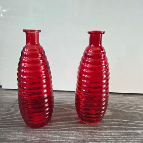 Myydään kaksi punaista lasia/maljakkoa. Korkeus n. 13,5 cm ja halkaisija ylhäällä n. 9,5 cm.