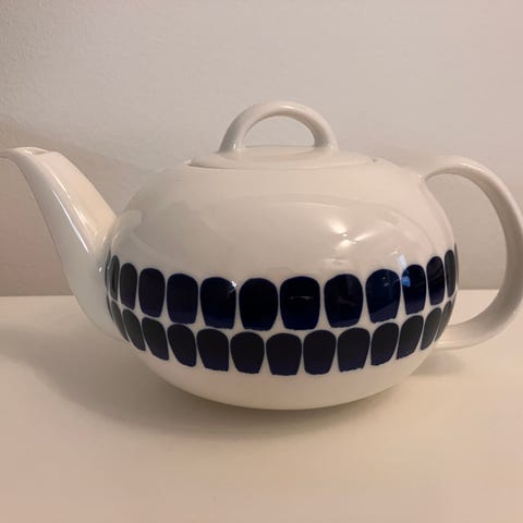Heikki Orvolan 1980-luvulla suunnittelema. Teekannut valmistetaan käsityönä. Valko-sininen teekannu on harvinaisempi. Kannua on käytetty kerran. Virheetön, ehjä, "uudenveroinen". Sisältää t-sihdin. (Voin lähettää kannun, mikäli ostaja maksaa "lasitavara" kuljetuksen.)