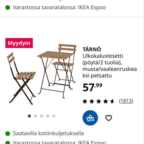 Myydään Ikean uudenveroiset Tärnö-parvekekalusteet eli pöytä ja kaksi tuolia. Mukaan tulee lisäksi myös näihin sopivat Tärnö-pehmusteet. Myös pehmusteet ovat uutta vastaavassa kunnossa. Tarvittaessa voin myydä myös pelkät tuolit ilman pöytää.