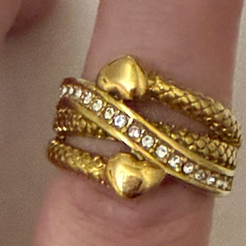 Myydään uusi todella näyttävä, leveä luja tekoinen sormus. Hyvin Kestävällä kullanvärisellä pinnoitteella. Leveys leveimmästä kohdasta n 12mm. Sormuksen koko 18. Materiaali ruostumaton teräs. Sormuksessa kirkkaita koru kiviä koristamassa. Ostajalle postikulut. Tulee normaalilla kirjepostilla.
