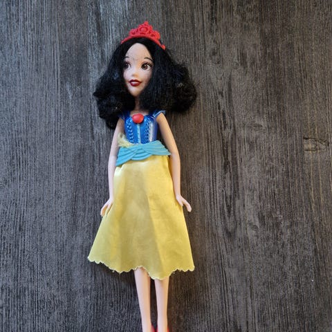 Disney barbie nukke. Käsityönä toteutettu poor (köyhä) versio Lumikki nukesta. Nukke hyvän kuntoinen ja polvet naksahtaa muutaman kerran nivelistä. Puukengät jalassa joita ei saa pois. Asu vaihdettavissa. Takana rautanepit.