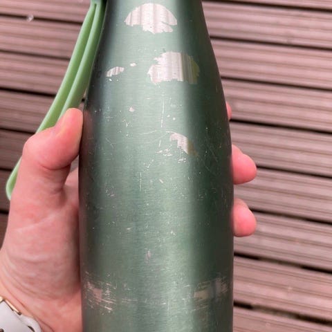 Harmaa, mattapintainen Drop of mindfulness termospullo. Pitää juoman kuumana tai kylmänä 10 tuntia. Pinta paikoitellen kulunut.