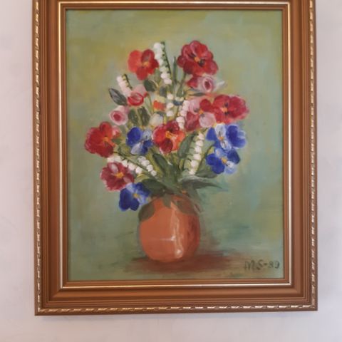 Maalaus, jossa on valkoisia kukkia valkoisessa maljakossa. Teos on kehystetty kullanvärisellä kehyksellä ja taustana on ruskea tausta. Sopii sisustukseen ja koristeeksi.