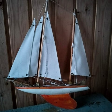 Kaunis antiikkinen purjevene omalla telineellä. Pituus 54cm, korkeus 61cm ja leveys 11,5cm. Todella kaunis koriste-esine maalle tai kotiin. Ihana joululahja merta ja purjehdusta rakastavalle.
