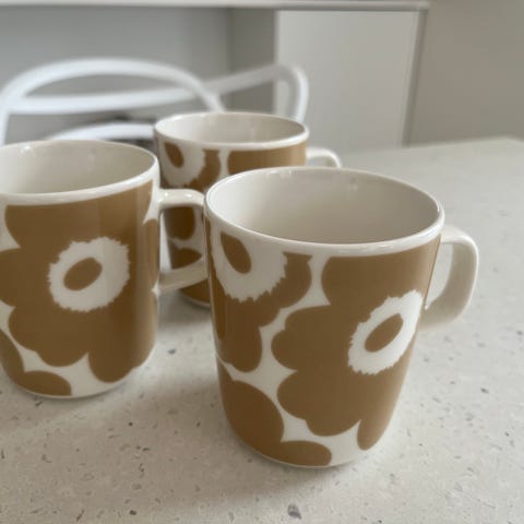 Muki /Marimekko Unikko, made in England. Kumpikin muki ehjä, hyväkuntoinen, myös sisältä. Mukin korkeus 9,5 cm. Hinta 12 €/ muki.