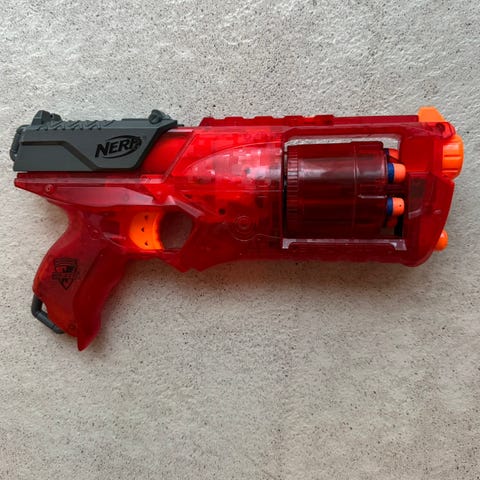 Myydään hyväkuntoinen Nerf N-Strike Elite Retaliator -automaatti leikkikivääri.