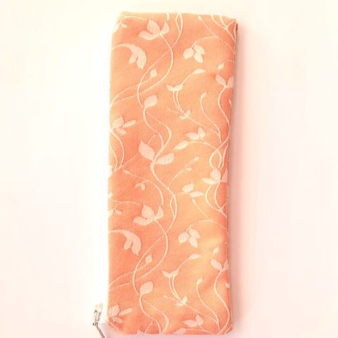 Ompelijalla teetetty vetoketjullinen pussukka pienen tavaran säilytykseen. Ulkomittat noin 20,5 x 7,5 cm. 100% puuvillaa, valkoinen vuori.