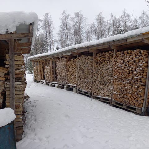 Kuivia koivuklapeja 60 litran pusseissa, h: 12 euroa/pussi.