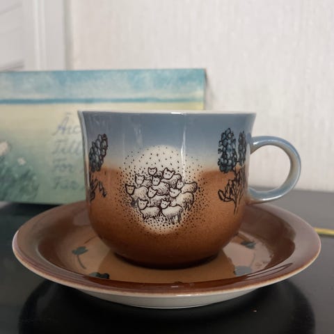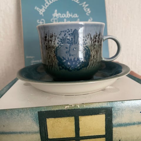 Arabian Äidin kuppi (1982) ja asetti. Design by Heljä Liukko-Sundström. Kunto erittäin hyvä, mutta pari hiusnaarmua löytyy (katso kaksi viimeistä kuvaa.