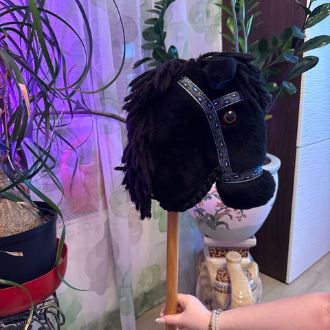 Käsin tehty keppihevonen, sisältää kepin. 55cm pitkä kepin kanssa. 26cm leveä.