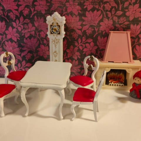 Nukkekodin takkahuoneen kalusteet .takka keinutuoli kaappi tuoli pöytä hedelmät kissa matto levysoitin .kaikki nämä kuvassa olevat 17€ posti 8.90 voin yhdistää muitakin ostoja tarvittaessa .tai nouto .