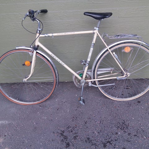 Ajokelpoinen miesten pyörä. Vaihteistossa on jotakin vikaa, kaikki vaihteet eivät toimi täydellisesti, mutta joka tapauksessa vaihteita pystyy vaihtaa isommalle ja pienemmälle. Satulaputki on ruostunut jumiin. Joitain pinnoja katkennut.