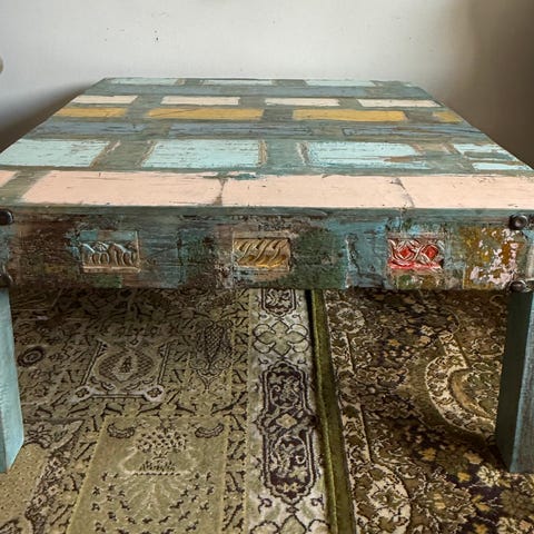 Mahtava ja upea messinkirunkoinen sohvapöytä savulasikannella.