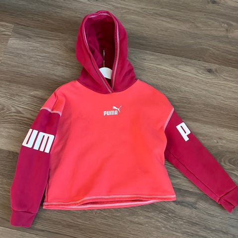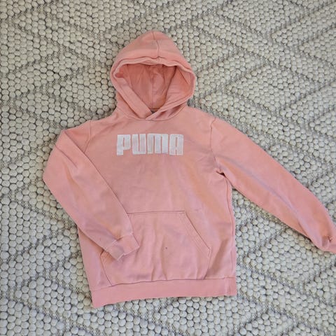 Musta huppari, jossa hopean värisellä puma teksti. Kokomerkintä 152cm, mutta on tosi pieni. Vastaa mielestäni kokoa 134 /140 paremmin.