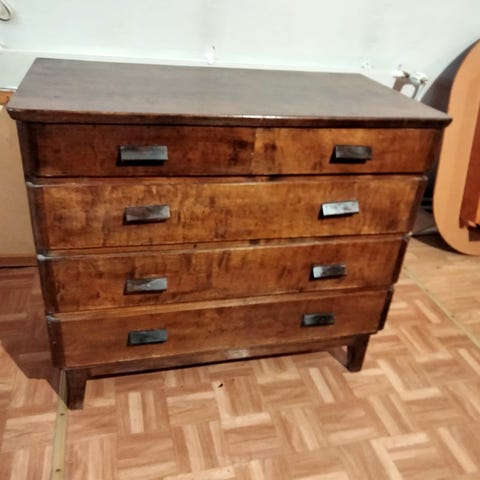 Vanha radiopöytä. Kulumaa yms löytyy, mutta todella tukeva, ehjä ja toimiva. Mitat noin K 64cm (jalat noin 8 cm), L 76 cm ja S 38 cm plus 2,5 cm kahva.