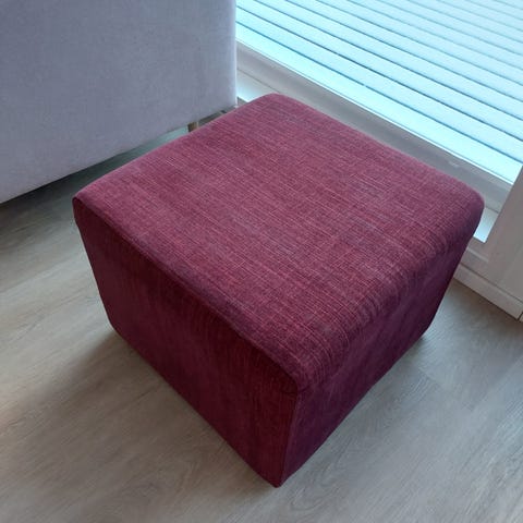 IKEA jalkarahi, jossa harmaa irrotettava kangaspäällinen ja valkoinen tukevan rakenteen runko. Sopii lisäistuimeksi tai jalkatueksi erilaisiin istuinryhmiin. Alkuperäinen väri koivu, maalattu valkoiseksi.