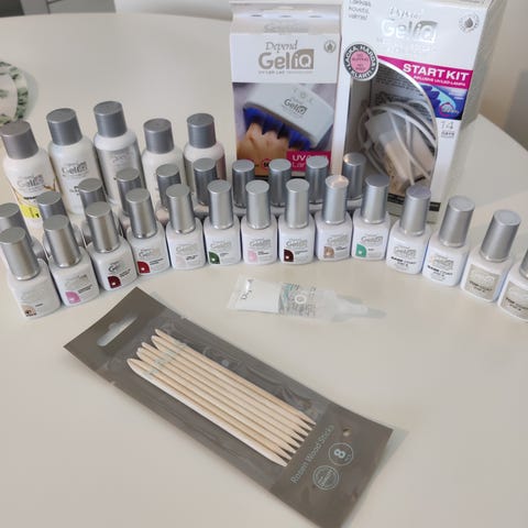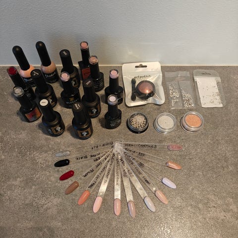 Lähes uusi geelilakkaussetti. Flow nails. 14 kpl värilakkoja, pohjuste, aluslakka, kirkas päällyslakka, glitterpäällyslakka + manicure tyyny + värikartta. Muutama lakkaus tehty näillä vain. Eivät sisällä TPO:ta.