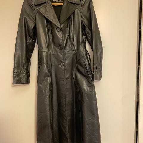 Malli ja tyyli: pitkä, kaksirivinen nahkatakki, jossa on vyö ja leveät kaulukset, tyypillinen trenssi- tai ajurimalli. Hihansuissa myös vyöt.