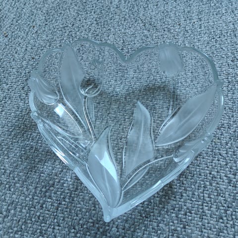 Kaunis lasilautanen kukkakuviolla esim. tarjoiluun. Koko 18 x 33 cm. Lautasessa matala syvennys. Pohjaväri huurrevalkoinen.