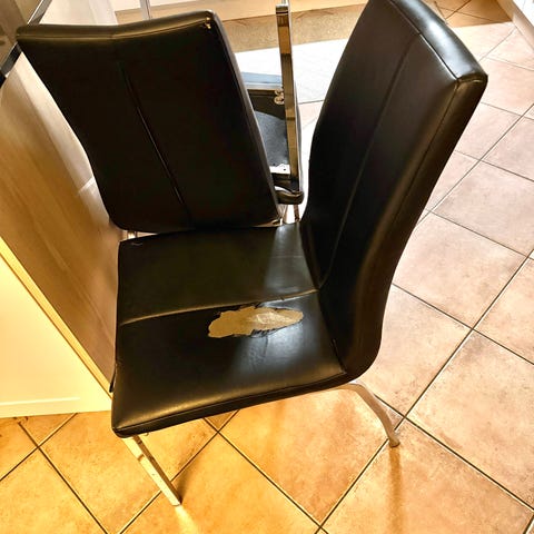 Giving away a dark gray (dining) chair. There are signs of use! It has not been tested to see if it will come off with a textile cleaner, for example. Sturdy to sit on.