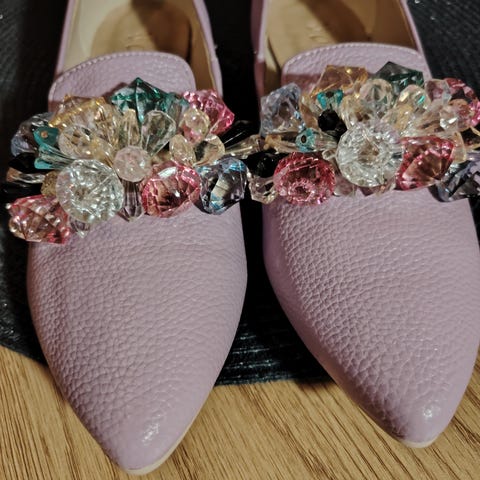 Käytetyt, mutta ehjät kiiltäväkankaiset juhlakengät, koko 37. Väri musta. Korko 7 cm. Kulumaa lähinnä pohjissa ja koroissa sekä oikean kengän kannassa takana. Näkyy kuvassa. Miellyttävät jalassa, jonkinlainen muotoiltu sisäpohja. Leveäkärkiset, mahtuu varpaat paremmin. Joustava nilkkaremmi helmikoristeineen.