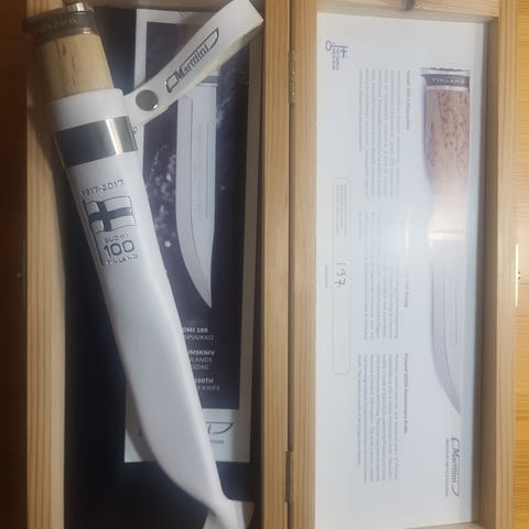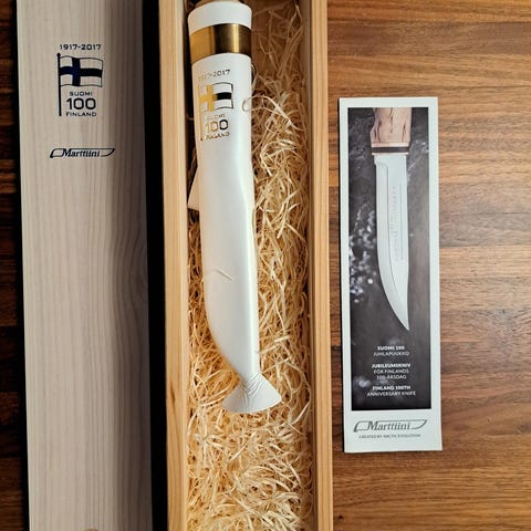 Mukana puinen lahjalaatikko. Puukon numero 910/2017. Puukkoa on säilytetty laatikossa.