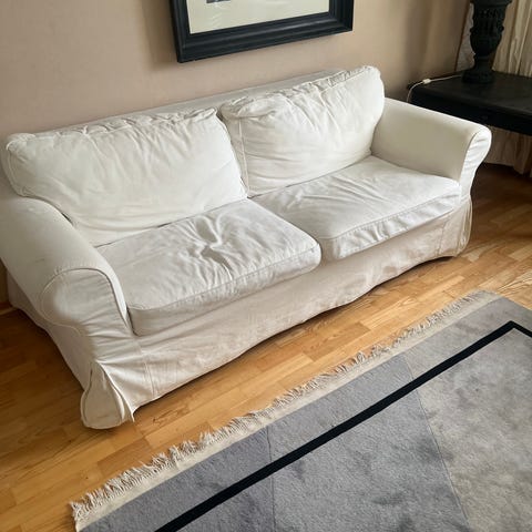 Kunto hyvä, vaikka kymmenisen vuotta vanha. Vasta pesty tekstiilipesurilla. Meillä ei ole lemmikkejä.