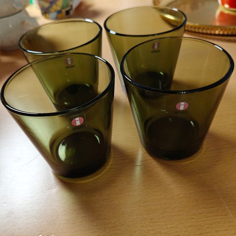 Uudet lasit laatikossaan (2kpl), värinä harvinainen, hieno oliivi, väriä valmistettu joskus pieni erä.21cl eli normaali koko