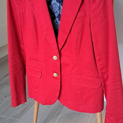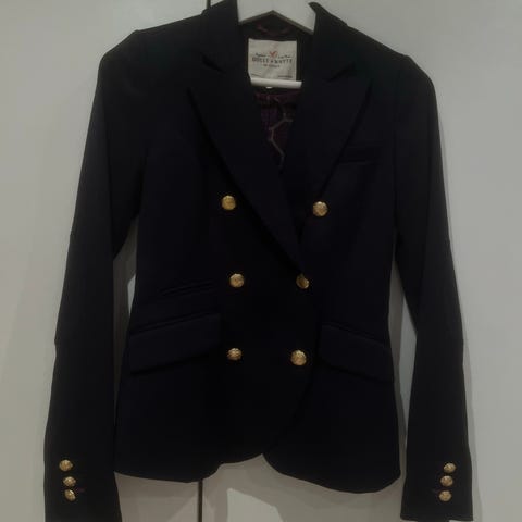 Happy Holly Naisten sininen bleiseri, koko 32/34. Takissa on koristeelliset napit edessä ja se on valmistettu 95 % puuvillasta ja 5 % elastaanista. Kiinnitys piilohakasin.