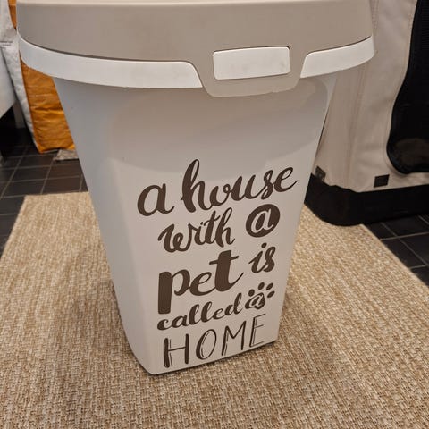 Pet Food säilytysastia valkoisella värillä. Sopii lemmikkieläinten ruoan säilyttämiseen. Ollut vähällä käytöllä