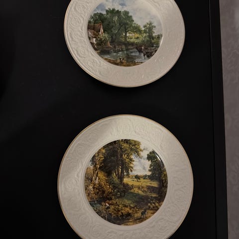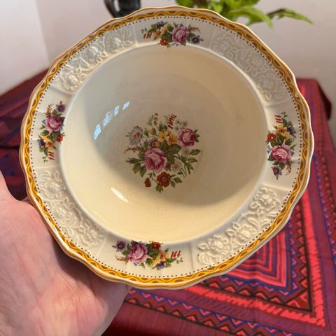 Ironstone Broadhurst Staffordshire Tudor Village lautanen, jossa on ruskea kuviointi ja kukkakoristeinen reuna. Lautanen on valmistettu kivitavarasta ja siinä on käsin kaiverrettu kuvio. Sopii astiastoon ja tarjoiluun. Yksi lautasista hieman vaaleampi kuin muut. Lisäksi Scottish Lochs Unicorn tableware koristelautanen mukaan.