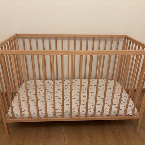 Noin vuoden käytössä ollut hyvä Ikean vaalean pyökin värinen Sniglar pinnasänky. Mukaan tulee halutessaan Ikean Krummelur patja. Patjan suoja pesty 60 asteessa hajusteettomalla pesuaineella.