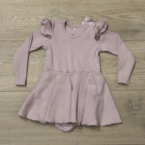 Kaunis valkoinen gugguun ribbimekko frilloilla. Ei enää uuden valkoinen ja hihassa pientä tummentumaa. Yleisilmeeltään kuitenkin vielä tosi siisti ja kaunis. Joustava, pehmeä materiaali joka vastaa hyvin kokoaan.