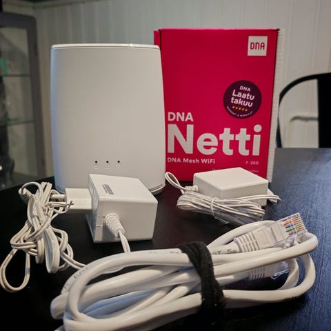 DNA Mesh WiFi F-3896 reititin sekä virtalähde.