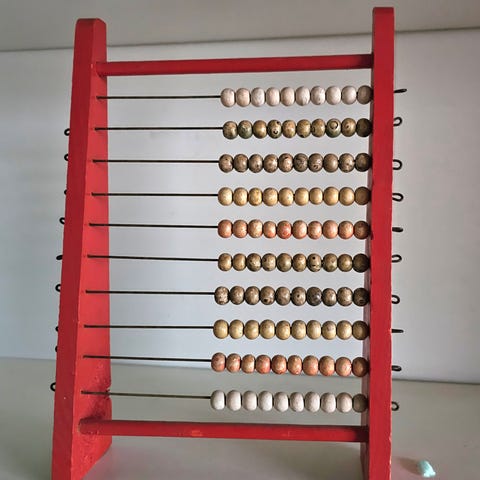 Puinen helmitaulu, jossa on 10 metallitangolla olevat värilliset helmet. Helmitaulu soveltuu laskemisen harjoitteluun ja opetusvälineeksi lapsille.