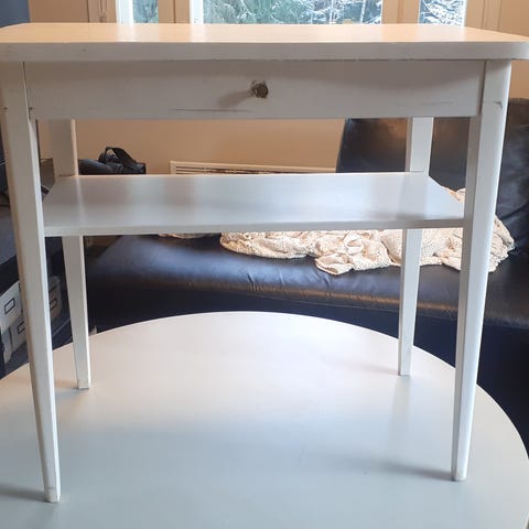 Maalaisromanttinen pieni lipasto. Käytön jälkiä löytyy jonkun verran. Alimman laatikon kahvoja ei ole mutta sen saa avattua kuitenkin.