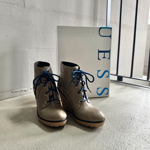 Käyttämättömät mustat nahkaiset Guessin platform korolliset nilkkurit, jotka vastaavat hyvin kokoaan. Kengissä kultaiset soljet yksityiskohtina. Mukana uudet kantalaput ja kenkien säilytyspussi. Jääneet itsellä kenkäpaljouden keskellä käyttämättä, niin myyn pois 😊