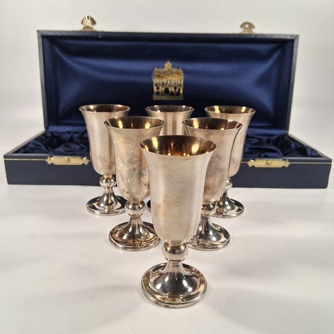 Kuvanmukaiset viinipikarit. Pikareita on 8kpl ja niille on omat säilytyslaatikot.