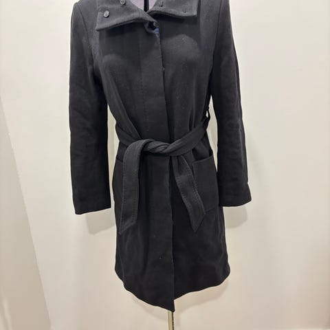 Polvimittainen villakangastakki, väri on hyvin vaalea harmaa. Koko on niukanpuoleinen, menee 36-38-kokoiselle. Kissatalous.