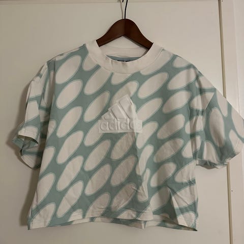 Adidas Marimekko T-paita, väriltään valkoinen, valmistettu puuvillasta. Naisten koko 38. Lyhyt malli, jossa painettu logo edessä.