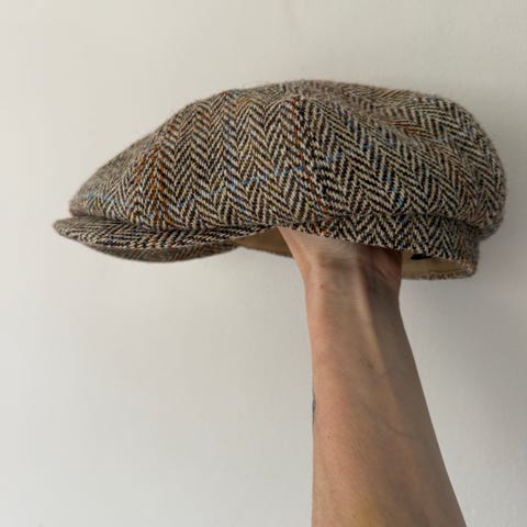 Viimeisteltyä tweedhattua kiertää ulkopuolella samasta kankaasta tehty 3,5 cm leveä vyöte.