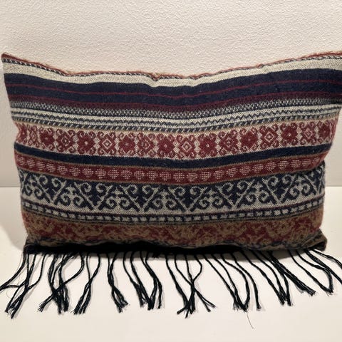 Kuviollinen koristetyyny, jossa toisella puolella ihan pieni virhe. Nouto Munkkiniemi.