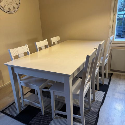 4 hengen pöytäryhmä. Yhdessä tuolissa jotain länttejä, muuten ok kunto. Mitat kansilevystä mitattuna 103cm x 103cm.