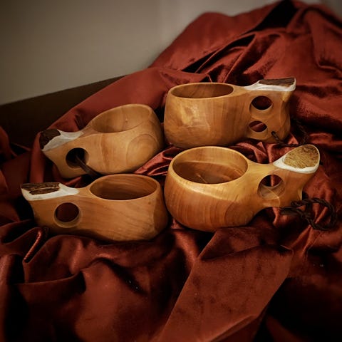 Näppärä koivunpahkasta tehty kuppi. Tehty aivan kuin kuksa mutta jätetty kahva osa pois, jolloin kulkee tilaa ja painoa säästäen mukana. Retkeilijöille ehdoton reppuun mukaan!
