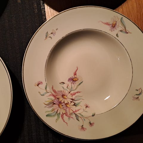 Malli on AX, sävyposliinia ja kaunis kukka-aiheinen siirtokuvakoriste nimeltään Maire, kultareunainen.