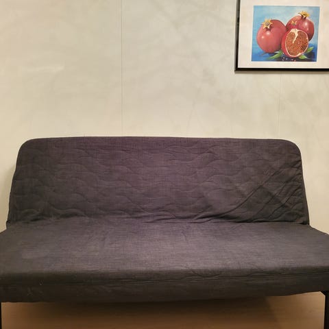 Tummanharmaa sohva, jota voidaan vetää ulos sängyksi. Vain nouto