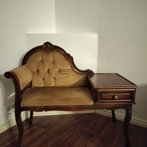 Puhelinpöytä, jossa laatikostot ja penkki. Tasosta irronnut vanerin päällinen. Muuten hyvässä kunnossa. Vain nouto Veikkolasta