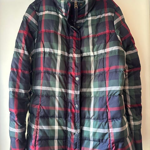 Tommy Hilfigerin takki, pituus 94 cm. Kiinteä huppu, irrotettava vyö, vanuvuori. Mukana alkuperäinen hintalappu ja varanapit. Kangas hylkii jonkin verran vettä, eli sopii räntäkeleihin. Koko M.